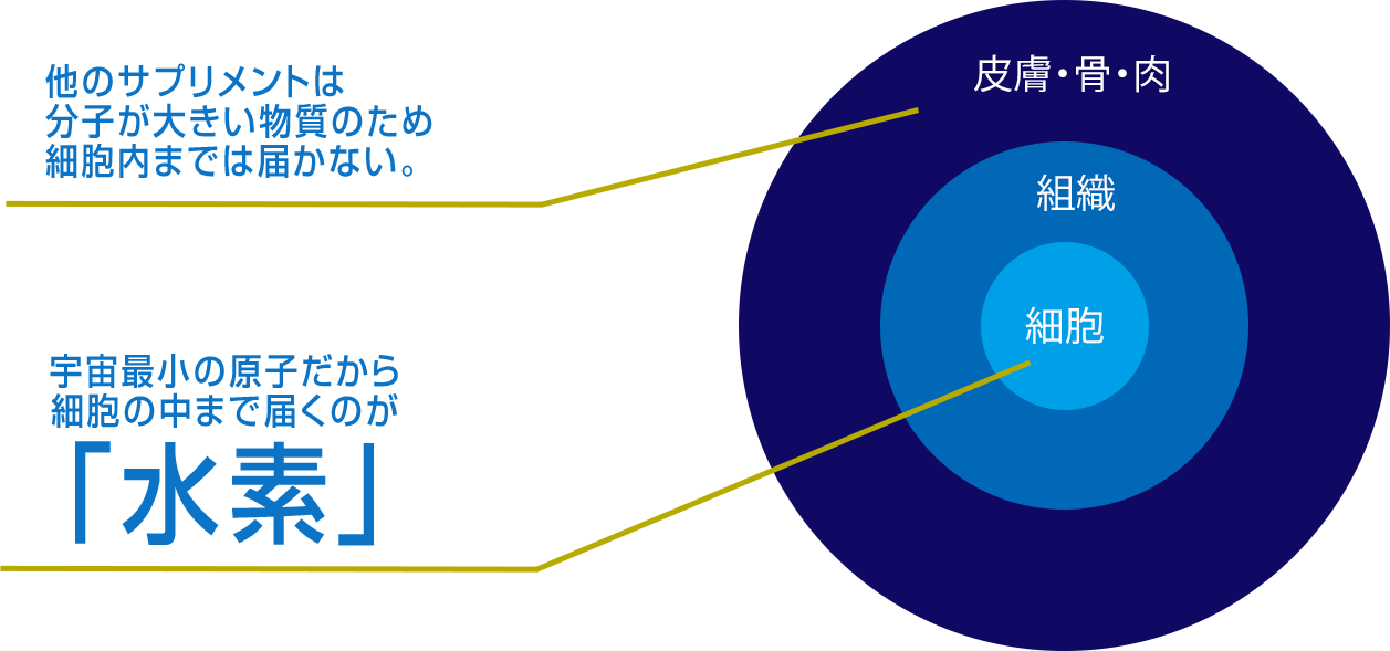 分子量の大きい他の物質では限界があり、体内の隅々まで行き着けないものが殆どです。